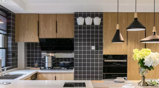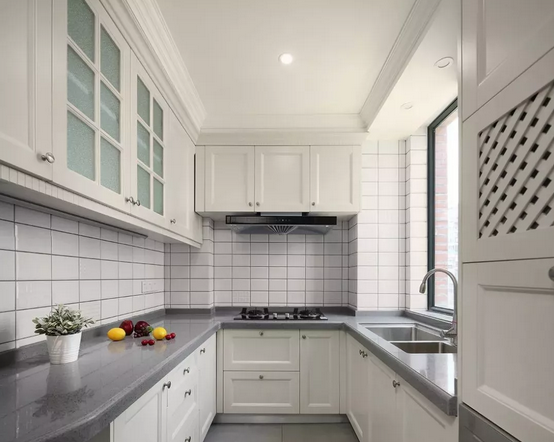 純白可能有些單調(diào),這個時候可以用局部亮點(diǎn)來點(diǎn)綴:餐具、臺面、電器、花卉都是搭配利器。后擋板也有無限創(chuàng)造性,大理石,花磚、馬賽克……你想得到的都可以用得上。