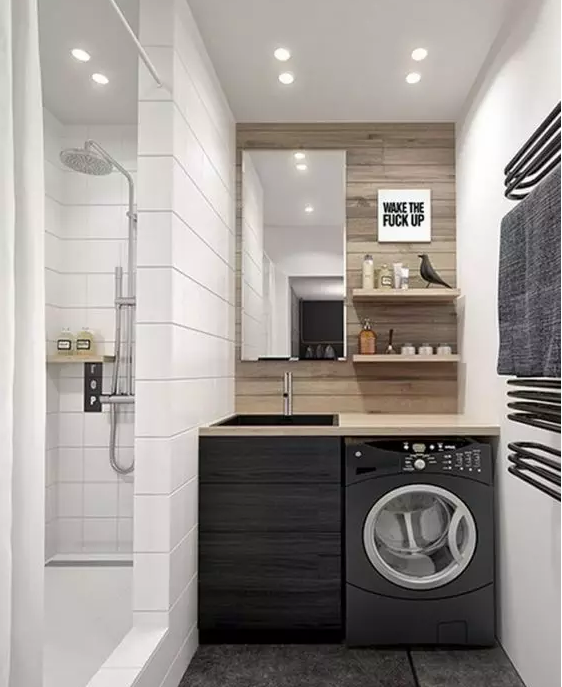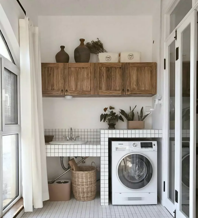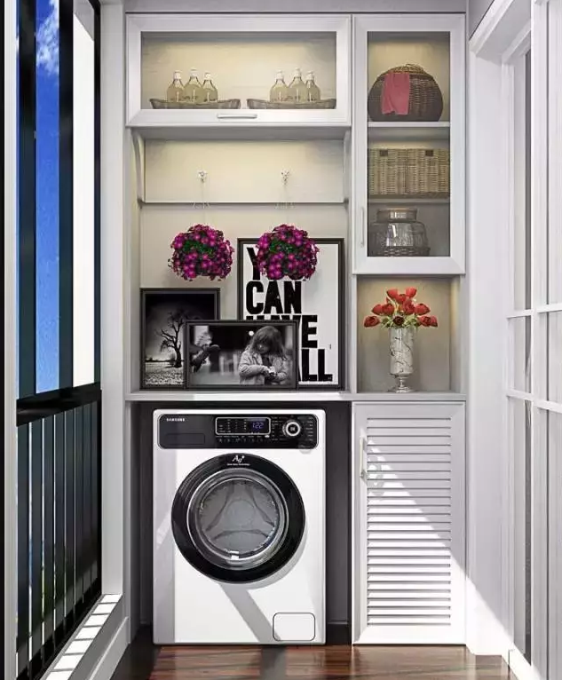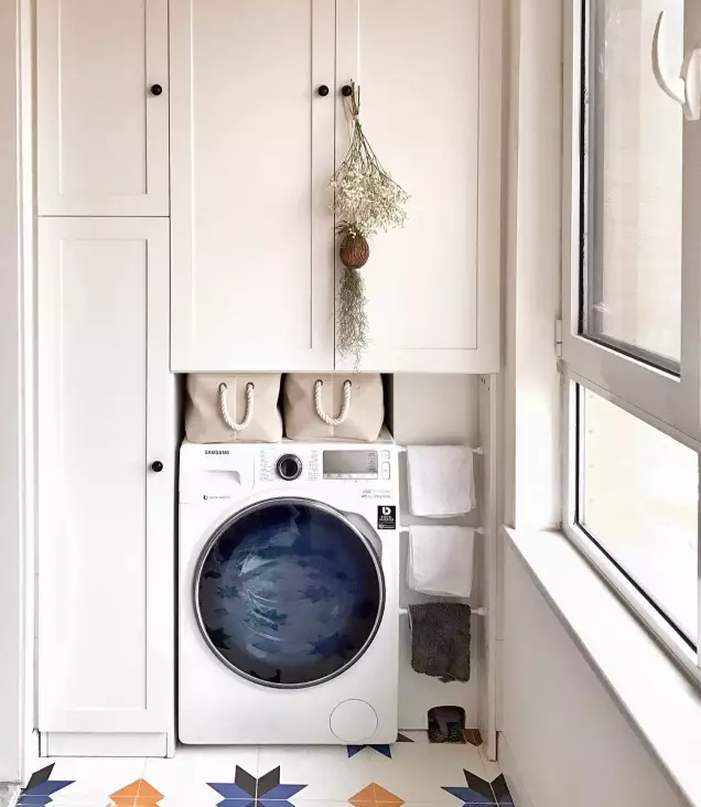 衛(wèi)生間面積不夠,或者覺得陽臺放洗衣機(jī)比較方便的小伙伴 ,也可以考慮把洗衣機(jī)放陽臺,這樣洗完直接晾曬。