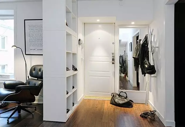 小戶型、一居室,床和門口離得近,不如在玄關(guān)處安裝一個大型置物架,不僅收納出門衣物,還能履行房間里的其他收納任務(wù)。只要你不擺的太滿,就不會影響采光。