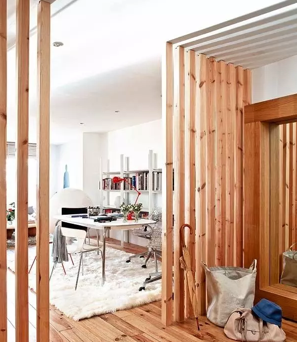 廢物利用妙極了,粗獷的原木色,又有天然的掛桿,吊起來就是個完美的玄關(guān)隔斷。