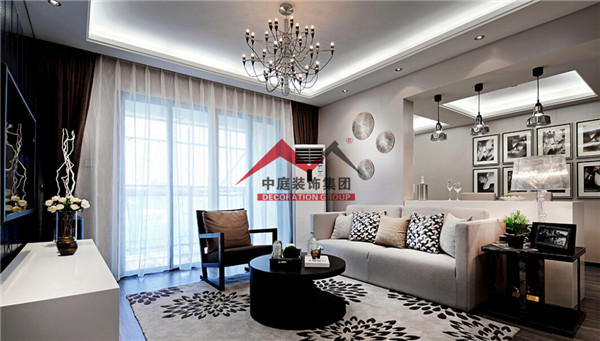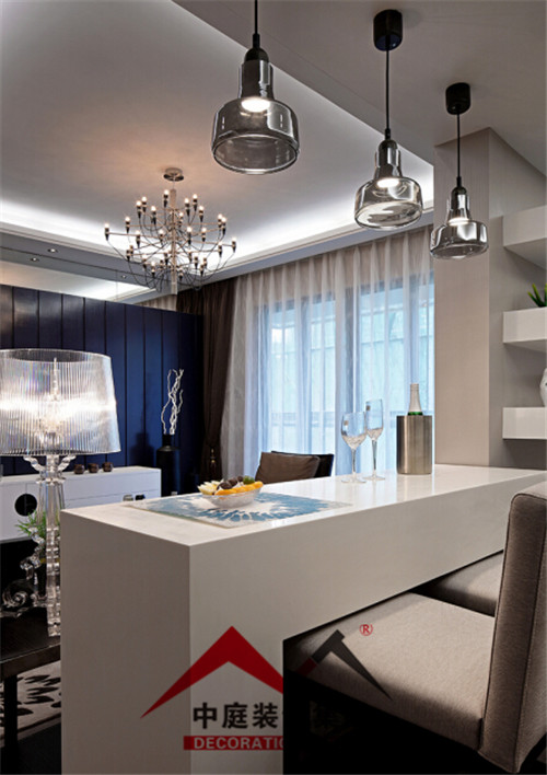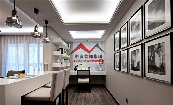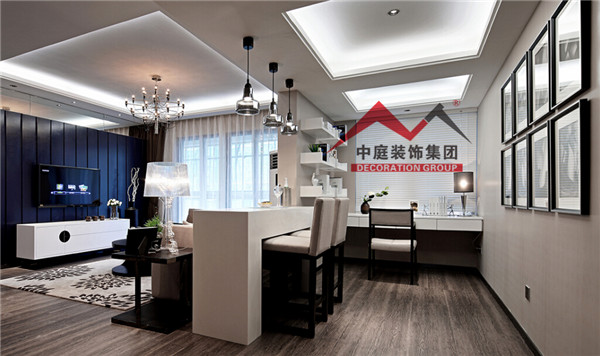 中間用一個(gè)吧臺(tái)把客廳和書房隔開,即實(shí)現(xiàn)了一個(gè)大客廳的視覺空間效果,又增加了客廳的裝飾生活情趣。