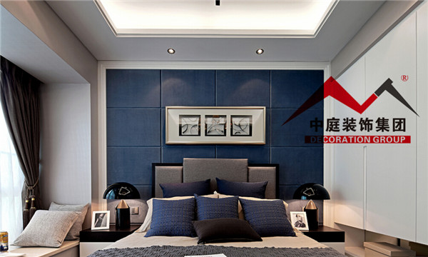 床頭采用深藍(lán)色做背景墻,與床上用品的顏色相結(jié)合。