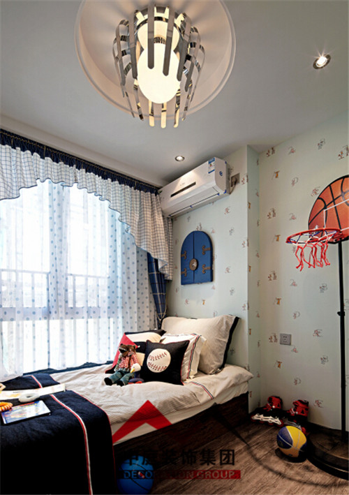 為了增加小孩的臥室樂趣,采用墻紙裝飾整體。榻榻米式的床側(cè)面做了幾個(gè)抽屜,增加了儲(chǔ)物空間,正以放小朋友的玩具。
