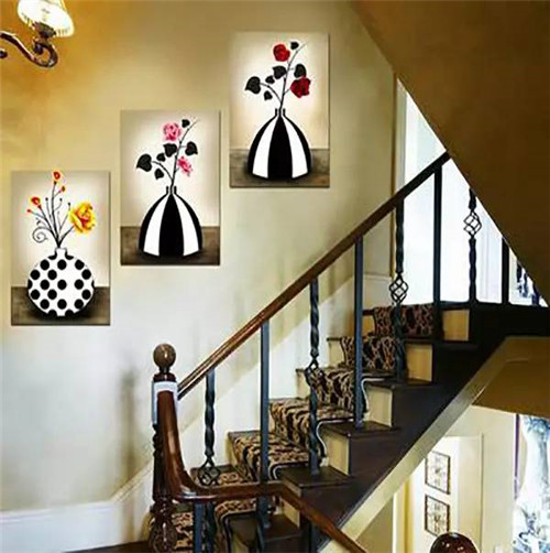 走廊和樓梯空間很容易被人忽略掉,但其實(shí)這些空間非常重要,而類似這種狹長空間,可以選擇同主題的組合畫。樓梯懸掛時可以高低錯落,順勢而掛。