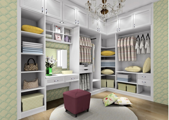 如果有這個(gè)條件,也可以像效果圖里一樣,設(shè)計(jì)一個(gè)小小的衣帽間,尋找于一片自己的小天地。