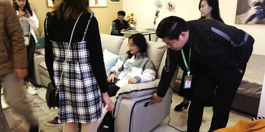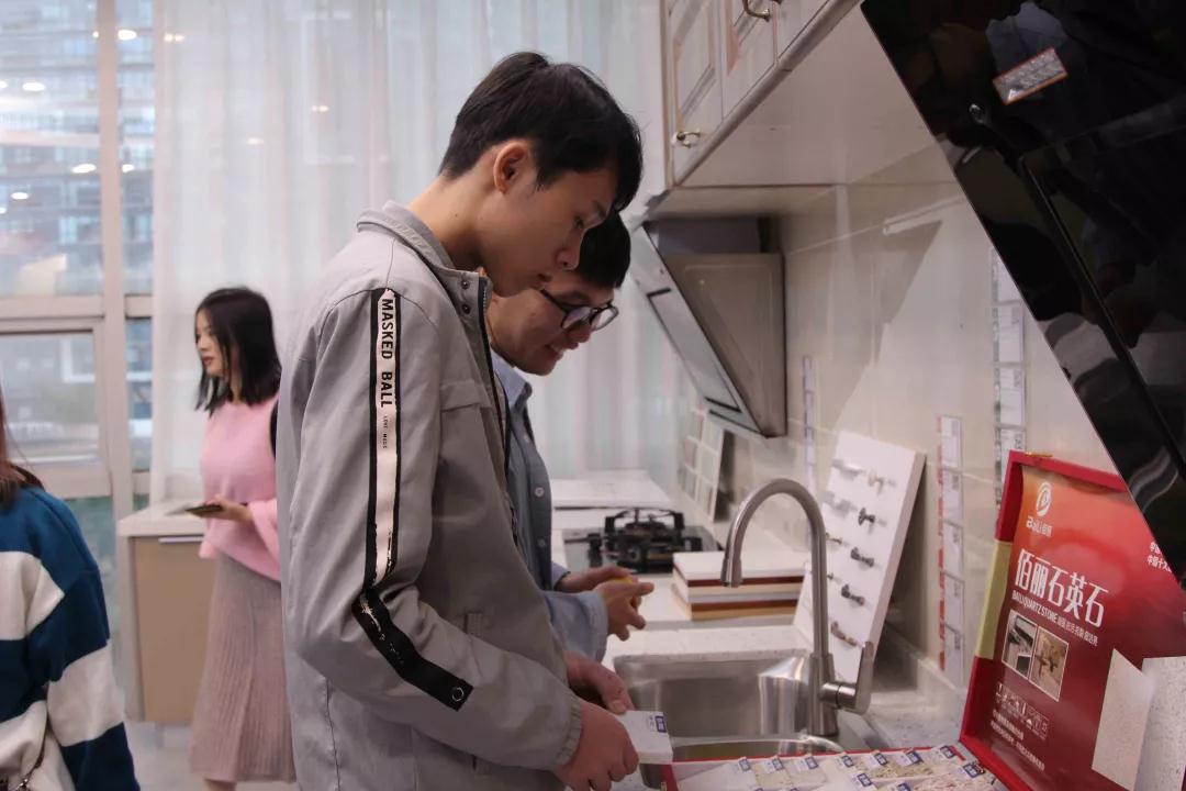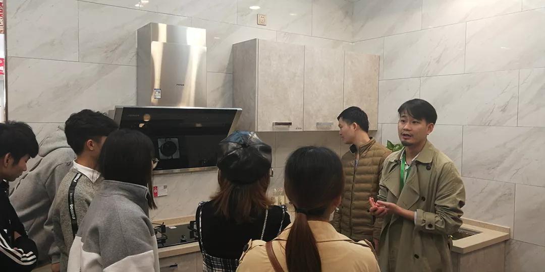 在廚房展示區(qū),設(shè)計部經(jīng)理韋昌豪和學(xué)生分享:“如果同學(xué)們今后決心要成為一名設(shè)計師,現(xiàn)在開始就要關(guān)注一些基礎(chǔ)的設(shè)計上的問題,對廚房的配置多做基礎(chǔ)的了解,平時也可以自己拿尺子量一些門、窗的尺寸。設(shè)計源于生活,設(shè)計師做出的設(shè)計也要根據(jù)現(xiàn)實生活來落地。”
