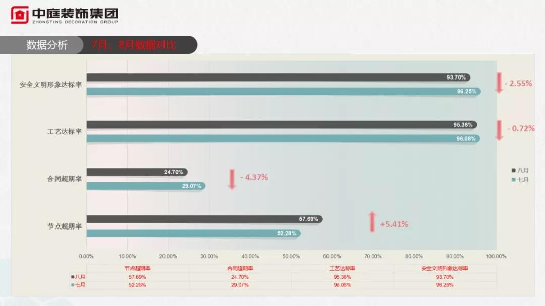 在總結(jié)8月份工作上,項(xiàng)目經(jīng)理個(gè)人月度達(dá)標(biāo)率和客服回訪業(yè)主評(píng)分成為衡量他們?cè)露裙ぷ鞯闹笜?biāo),每到這個(gè)環(huán)節(jié),大家的心都懸到了喉嚨眼,但凡工藝達(dá)標(biāo)率和安全文明形象達(dá)標(biāo)率沒(méi)有達(dá)到90%及以上的,都要上臺(tái)面向所有人承諾,下月勢(shì)必做好工地管理,雙向達(dá)標(biāo),否則按制度處罰!