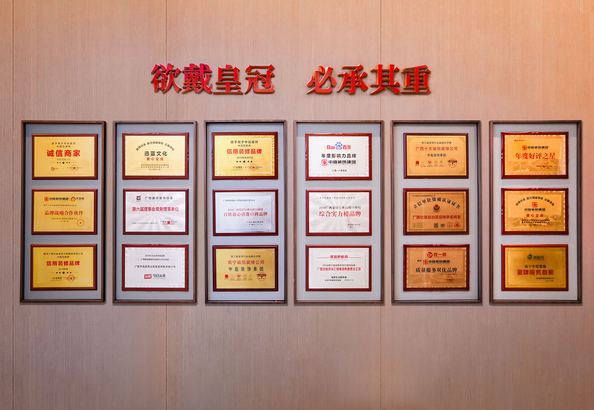 集團(tuán)堅(jiān)持以匠魂匠心筑家,憑借統(tǒng)一規(guī)范的施工工藝、卓越的品質(zhì)、良好的信譽(yù)及優(yōu)質(zhì)的服務(wù)頻獲認(rèn)可,多次榮獲“3·15誠(chéng)信企業(yè)”、”廣西壯族自治區(qū)信用裝飾示范企業(yè)”、”廣西壯族自治區(qū)信用承諾商家”、“百姓放心消費(fèi)口碑品牌”、“廣西影響力·工匠精神品牌”等榮譽(yù)稱(chēng)號(hào)。