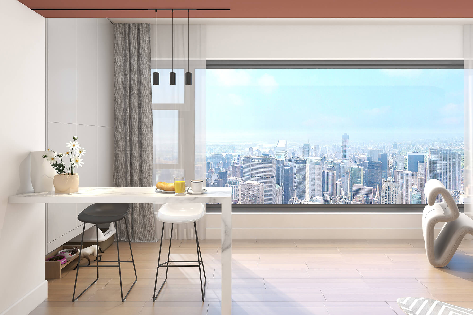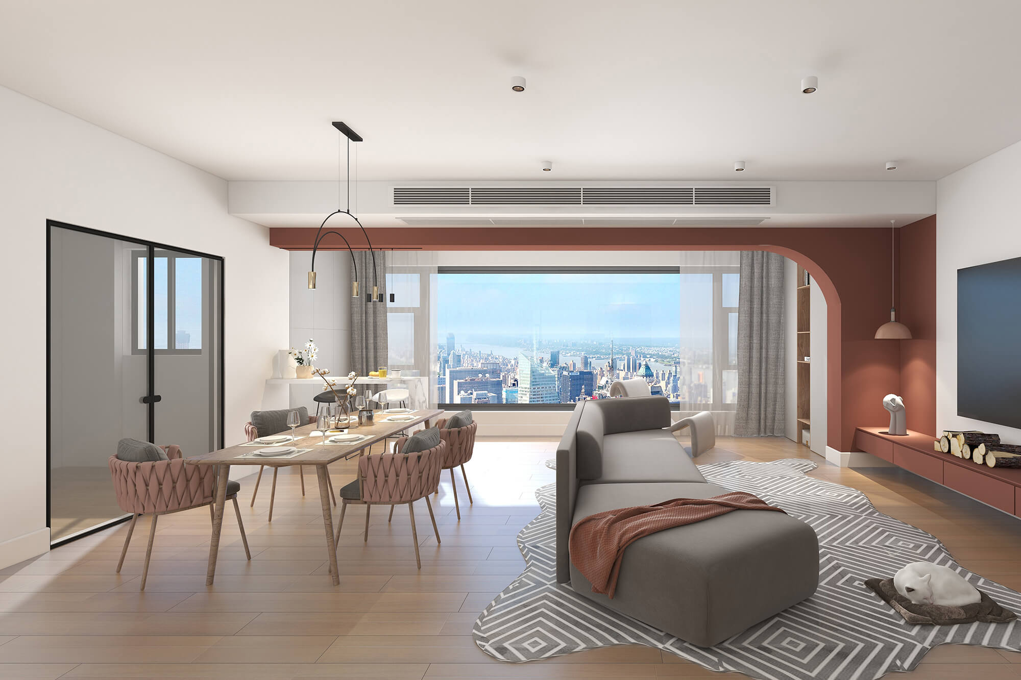本案設計師基于人與動物、環(huán)境之間的大融合的考慮,實現(xiàn)了人們想要追求的一種泛空間,家庭不再是以空間而定位,而是以氛圍而定位。比如說男女主人在辦公的時候,可以在客廳、餐廳跟貓咪玩耍,或者在做飯的時候也能夠和外面的人互動,空間既獨立又融合。