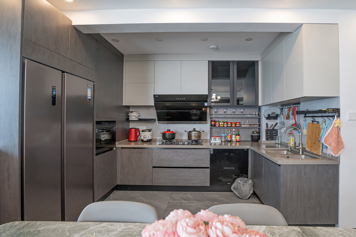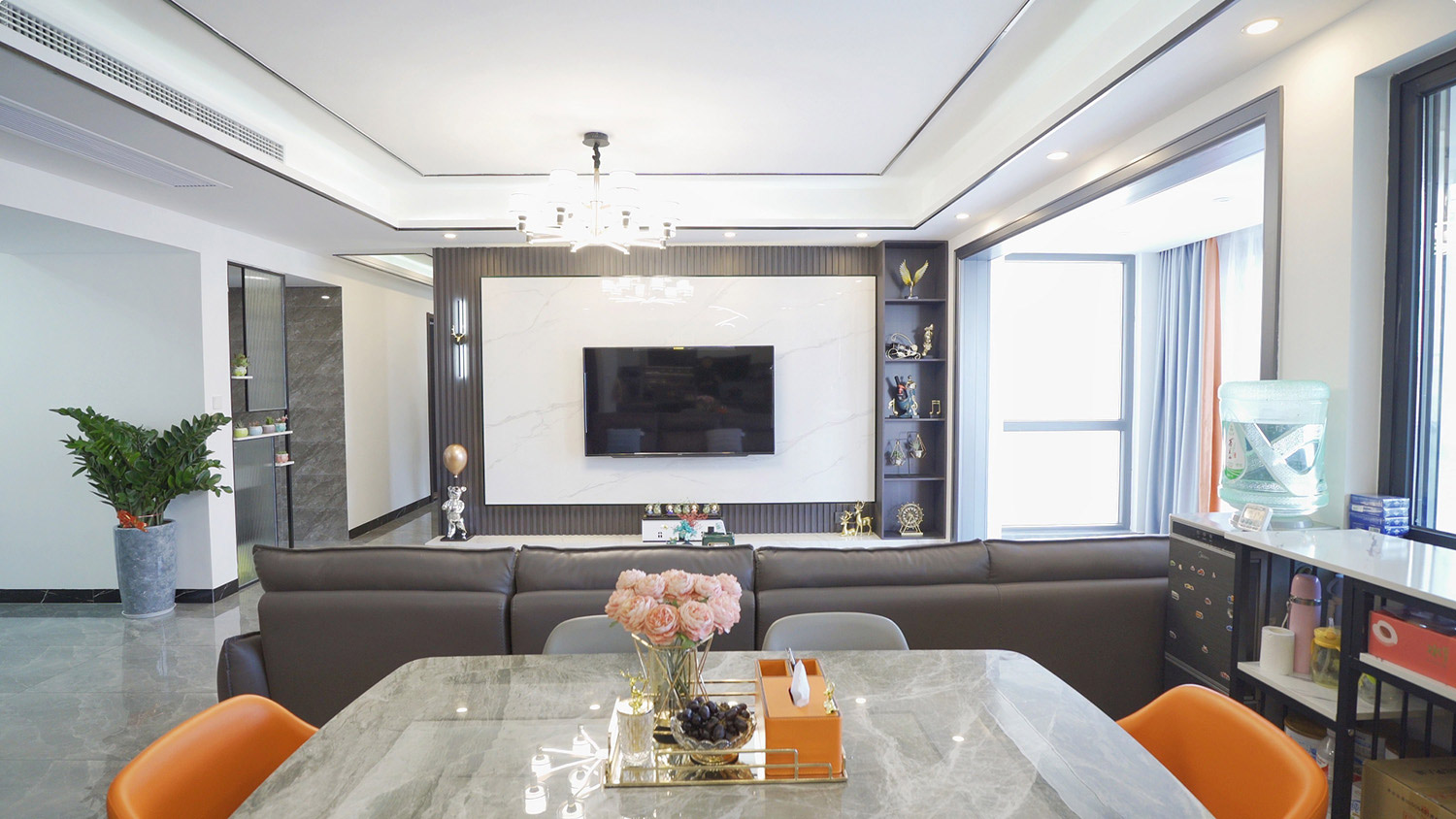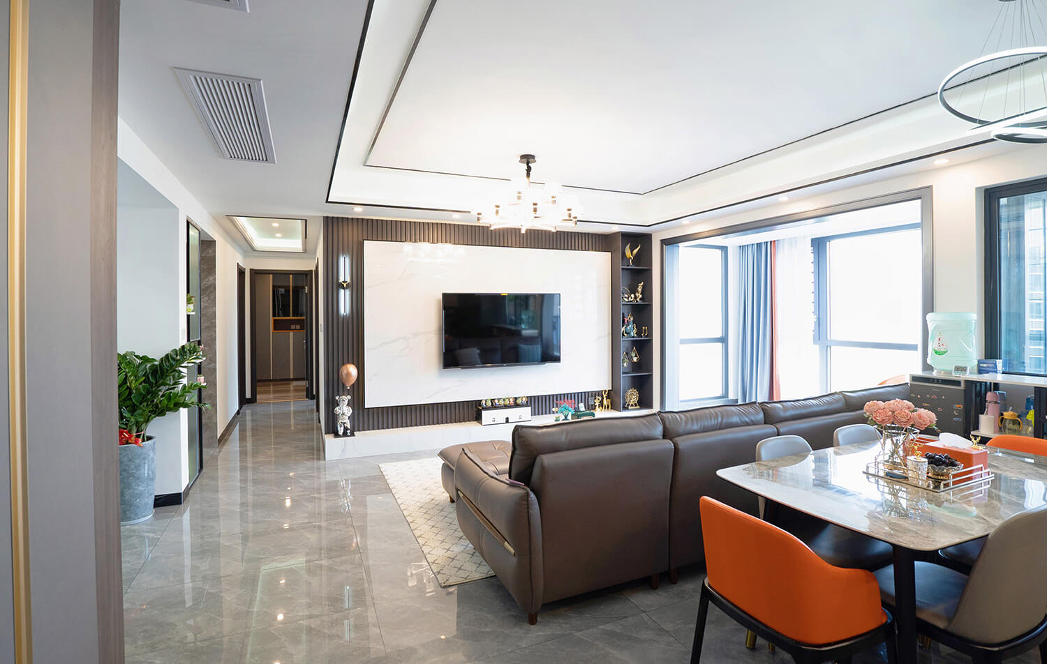 本案戶型為:4房2廳2衛(wèi),總面積126㎡。業(yè)主是4口之家,需要解決空間分布緊密的問題。設(shè)計師立足于現(xiàn)代輕奢風(fēng),打破傳統(tǒng)的空間格局,通過LDK一體化的設(shè)計,打造開放的生活空間,滿足了當(dāng)代家庭生活的情感需求,實現(xiàn)了融合式的生活場景。