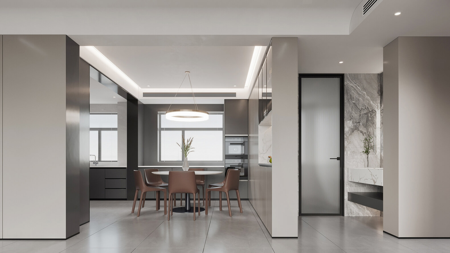 “灰”介于黑與白之間,它模糊著空間的絕對邊界,而“白”是開放,亦是隱藏、極簡。空間以灰和白作為主基調,將自然、柔和、開放的各個功能板塊巧妙地融合,呈現(xiàn)一種清新典雅的高級感。
