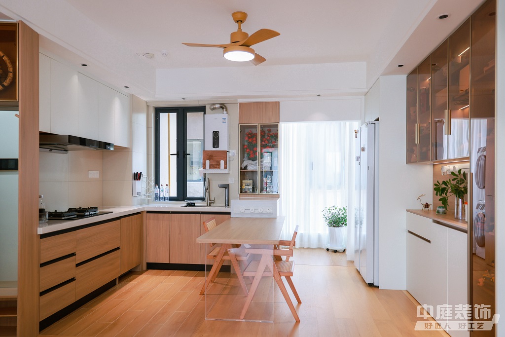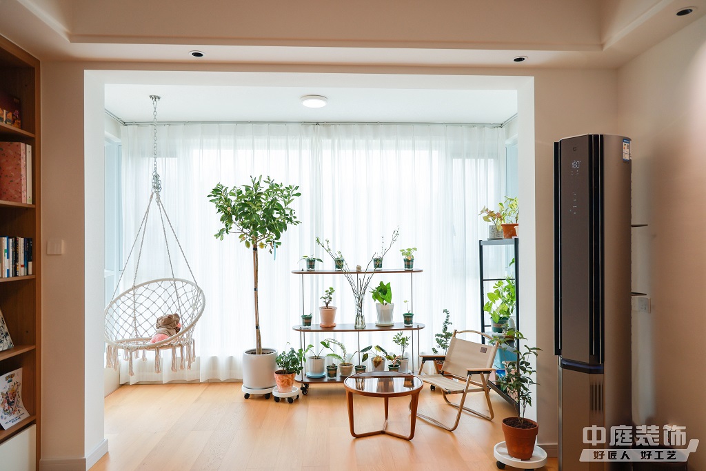 仿佛步入了一個自然與簡約交織的溫馨空間。淺色調的木質地板營造出一種質樸而不失高雅的氛圍。客廳中央,去客廳化的設計,一排原木色到頂書架擺滿精心挑選的物件和書籍,一進門就能感受家的溫暖。
