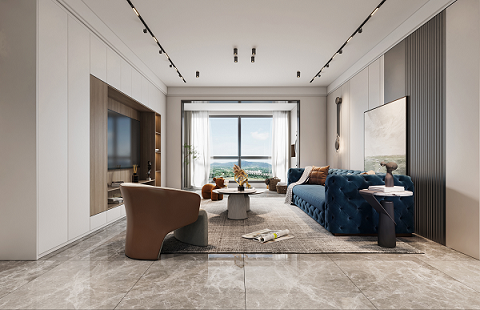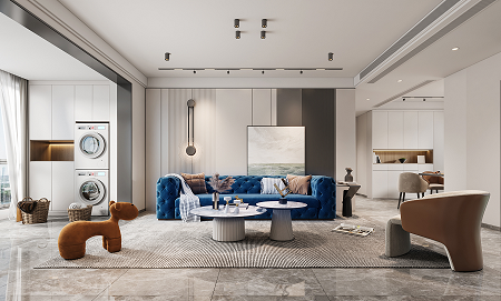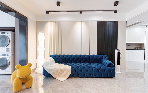 使用更親近自然的棉、麻、木搭配黑、棕、白、灰色,在裝飾上極度的克制,給人高品質(zhì),舒服的感受。削弱復(fù)雜造型和色彩對人情緒的影響,反而產(chǎn)生了治愈的力量??巳R因藍(lán)沙發(fā)的點(diǎn)睛之筆,顯得整個(gè)空間更加自信,給人傳遞高級的視覺感受。