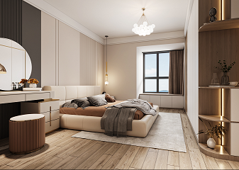 竹炭飾面護(hù)墻板做背景,是大空間設(shè)計(jì)元素在小空間的延續(xù)。主臥沒有做過多的造型,大量留白,通過軟裝設(shè)計(jì)師的巧手來營造氛圍,利用不同色系與材質(zhì)對比組合形成精致豐盈的裝飾效果,風(fēng)吹簾動(dòng),琉光行云,主臥釋放著樂且晏如的溫柔情緒