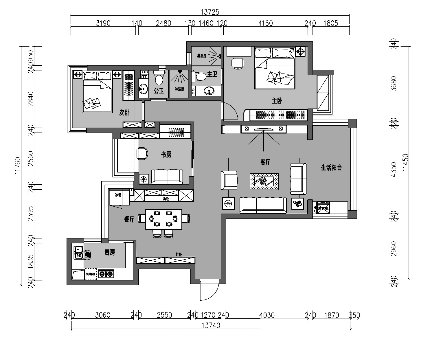 1、改變書房的開啟方向,面朝客廳,實(shí)現(xiàn)客廳及書房的南北通透。補(bǔ)充客廳的采光,實(shí)現(xiàn)活動(dòng)及私人空間的分區(qū)更加明朗。